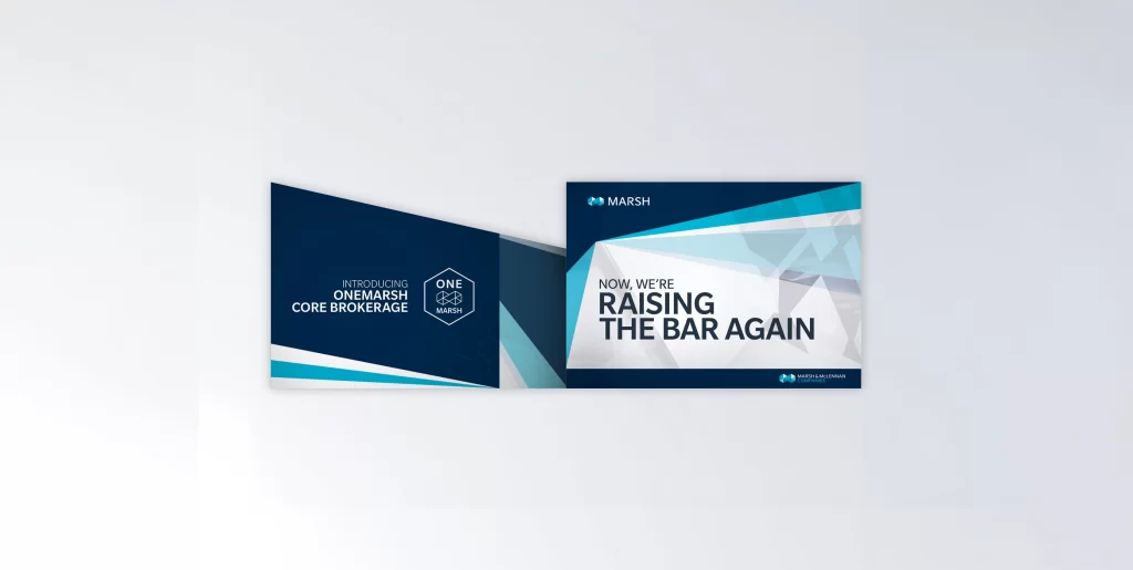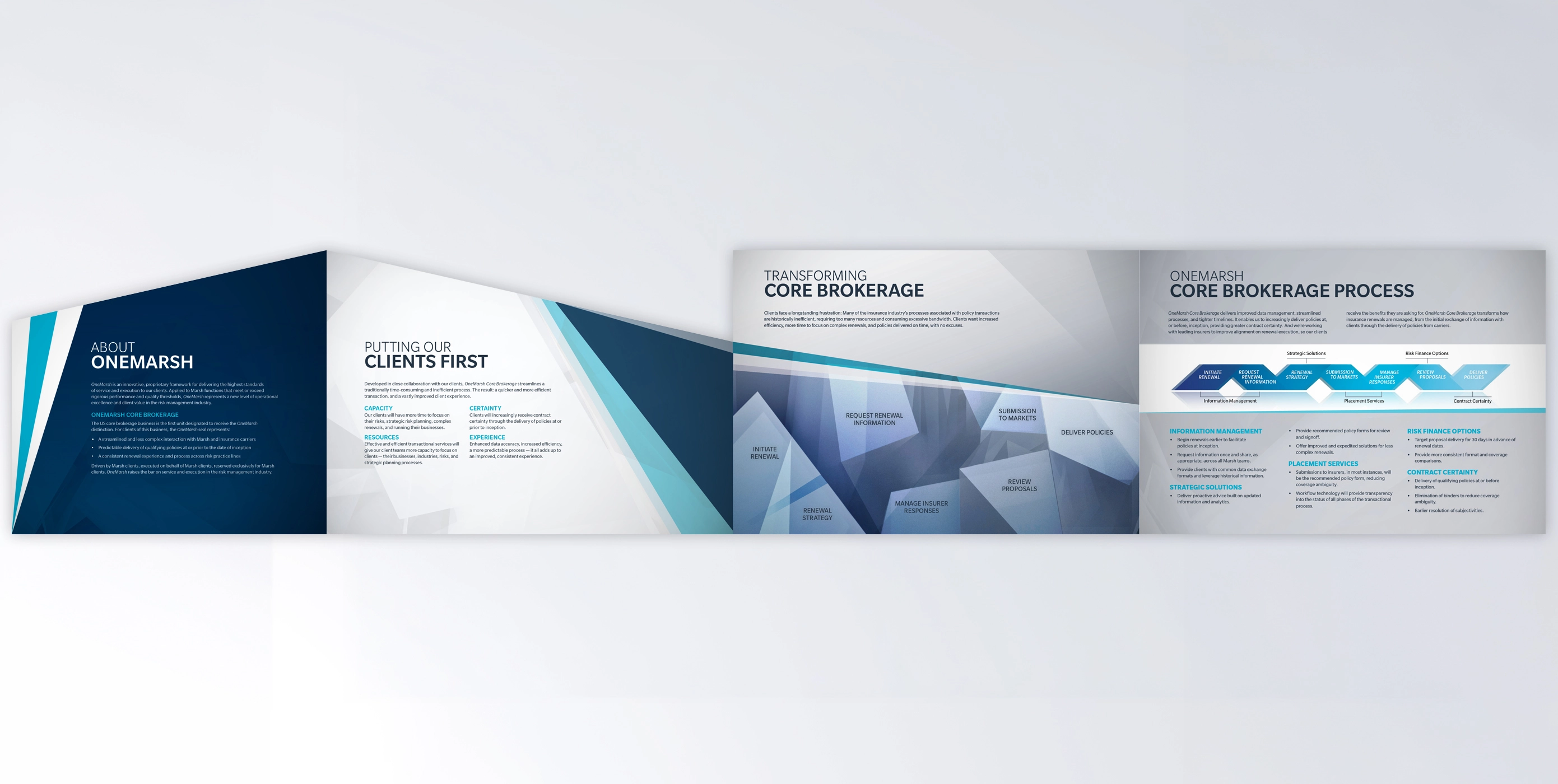 OneMarsh was a new business initiative designed to bring new efficiencies and streamline the process of its core brokerage client offerings. The objective was to create a dynamic mailer to build excitement and clearly communicate the announcement while guiding clients through the story in an engaging way.